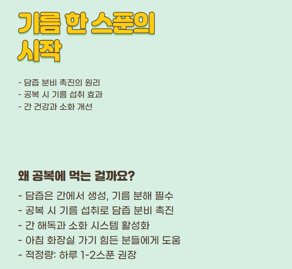 사람들이 공복에 기름을 먹는 이유는 생각보다 단순하면서도 과학적인 이유가 있어요. 바로 담즙 분비 촉진 때문인데요.