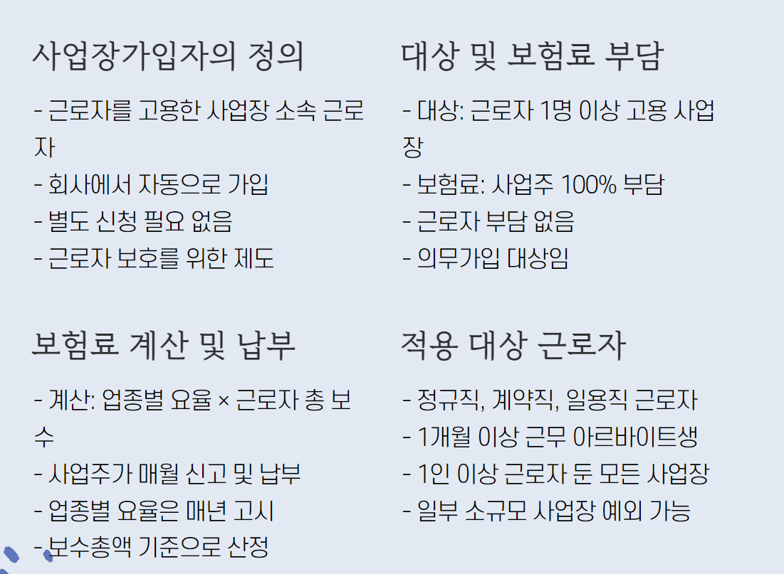 - 보험료 부담: 사업주가 100% 부담 (근로자는 부담 X)