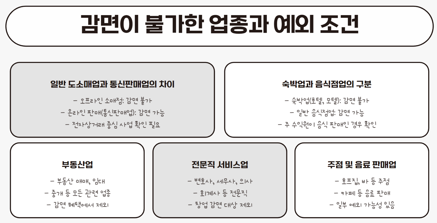 | 주점 및 음료 판매업 | 호프집, 바, 카페 등 주류와 음료를 주로 판매하는 업종은 감면 불가 |