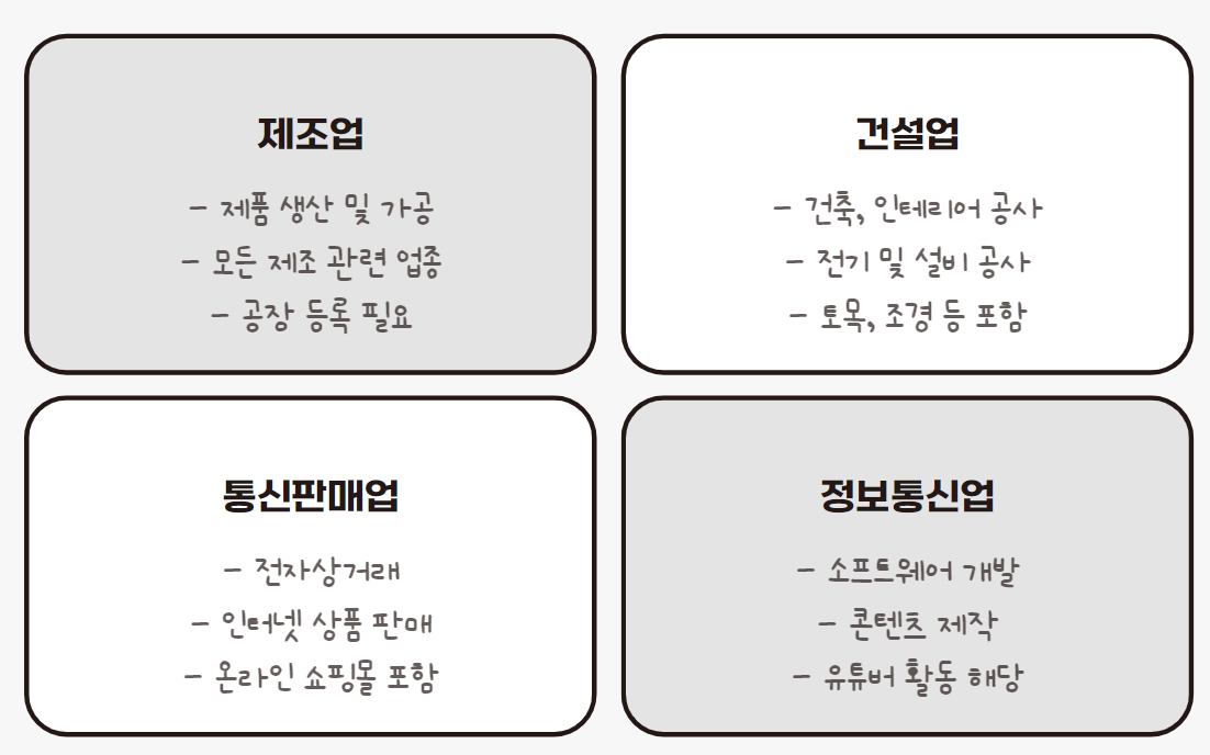 | 건설업 | 건축, 인테리어, 전기 및 설비 공사 등 모든 건설 관련 업종이 포함됩니다. |