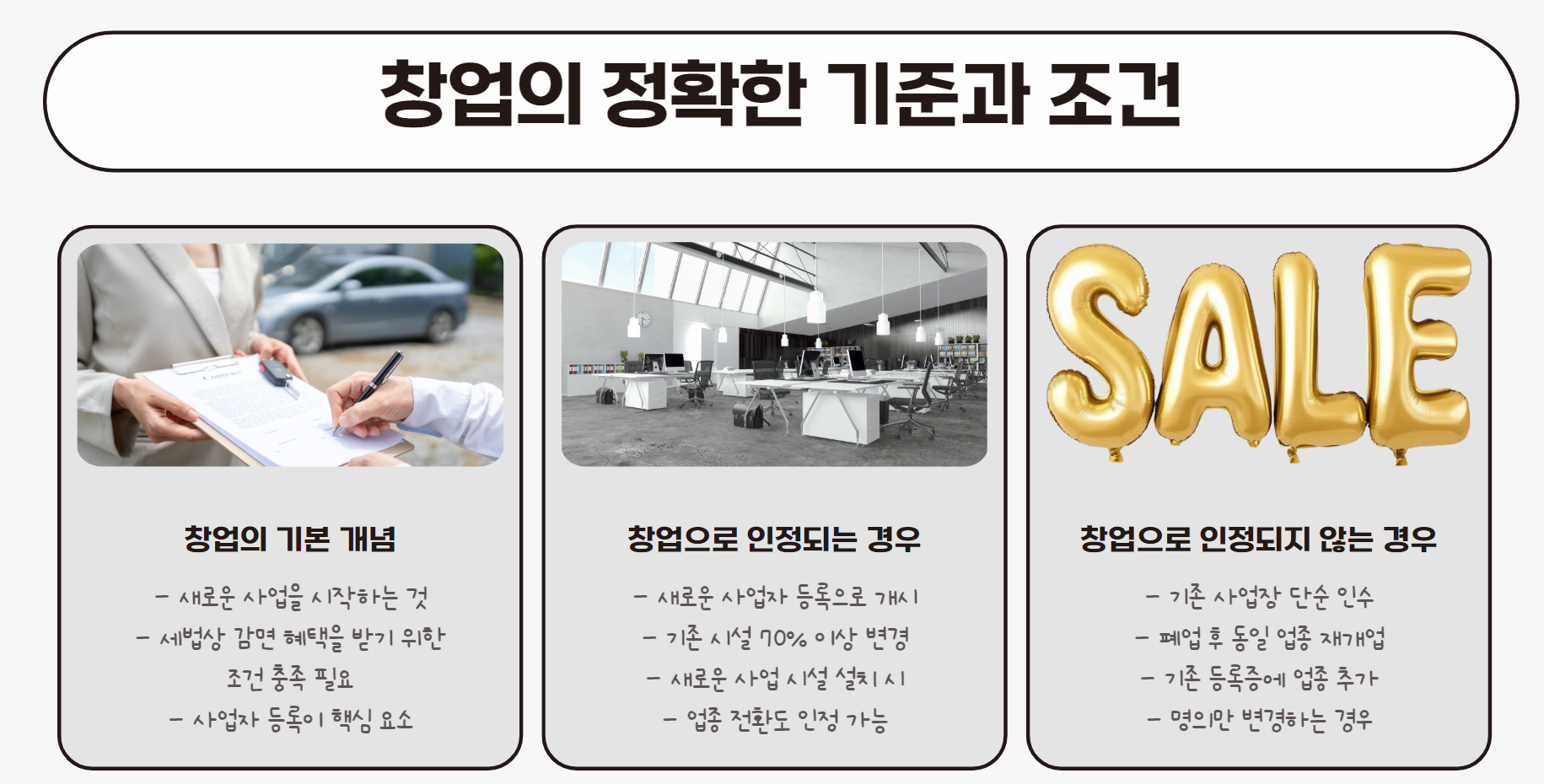 창업의 기본 개념은 새로운 사업을 시작하는 것입니다. 하지만 세법상 감면 혜택을 받기 위해서는 몇 가지 중요한 조건을 만족해야 하는데요.