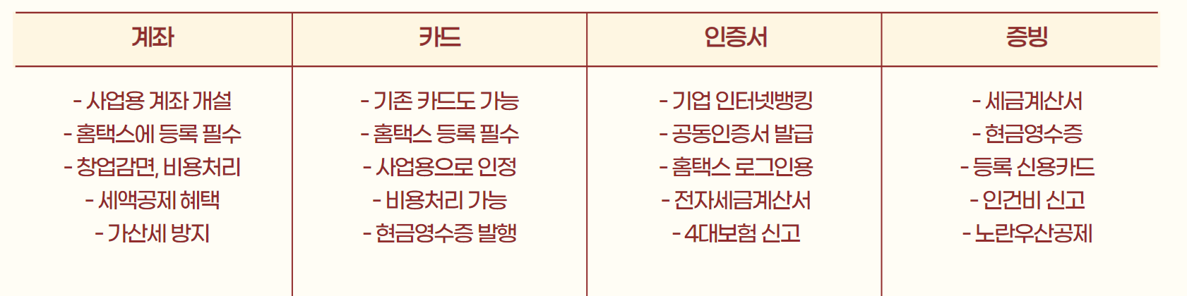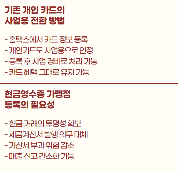 사업용 카드 따로 안 만들고 기존 쓰던 개인카드도 OK! 대신 홈택스에 등록만 해주시면 됩니다. 카드 혜택 좋은 거 그대로 써도 되고, 등록만 잘 해 놓으면 그게 바로 사업용 카드예요. 단, 카드 단말기 없이 현금만 받는 업종(인테리어, 실내건축 등)은 현금영수증 가맹점 등록을 반드시 하셔야 합니다. 카드 단말기 없으면 자동 등록 안 되거든요. 현금 받고 현금영수증 발행 안 하면 가산세에 창업감면도 날아가요. 😭 조용히 큰 손해 보는 포인트 중 하나!