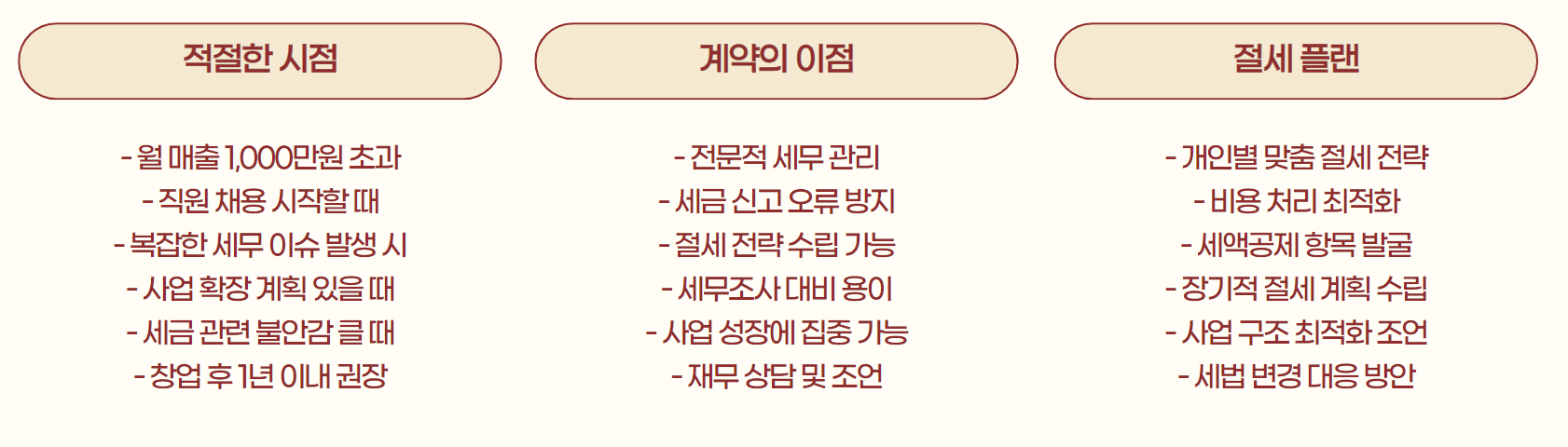 인건비 지급이 시작됐을 때, 매출이 월 1,000만 원 이상 발생하기 시작했을 때가 딱 그 타이밍이에요. 이 시점에 세무사랑 손잡으면 가산세 방지 + 절세 플랜 시작할 수 있습니다. 무작정 계약은 부담일 수 있지만, 시기 잘 잡으면 투자 이상의 효과 나와요!