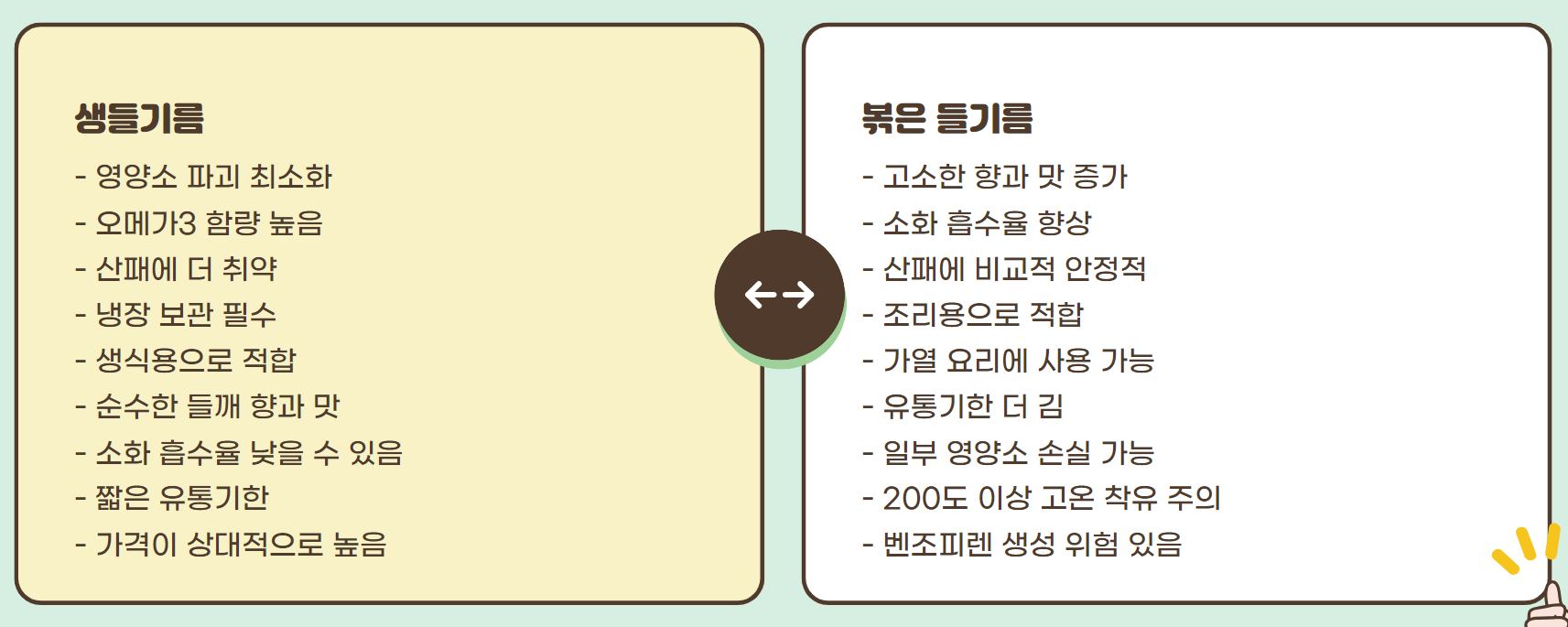 산패가 걱정되신다면 생들기름이 좀 더 안정적일 수 있어요.